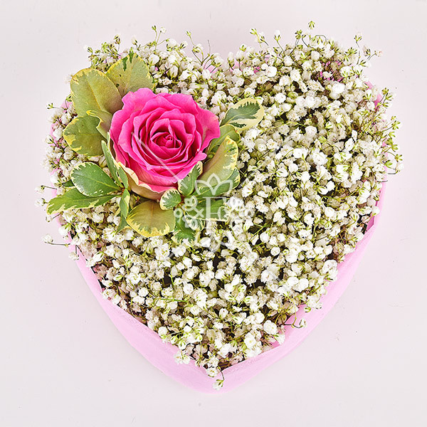 Представленная здесь белоснежная  гипсофила  выглядит легко и невесомо,  словно миллион восторженных фраз, сказанных для любимой. Но главный акцент композиции – прекрасная розовая роза в окружении зелени  питтоспорума! Композиция выглядит потрясающе нежно, привлекательно и мило.