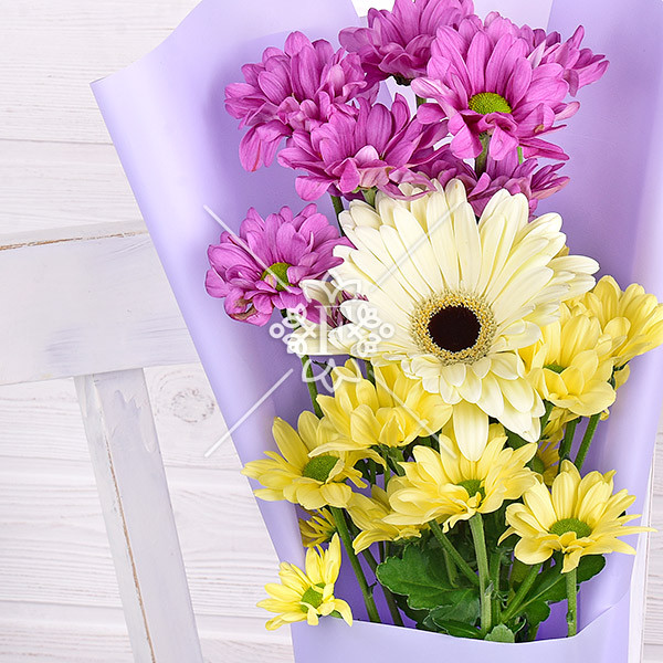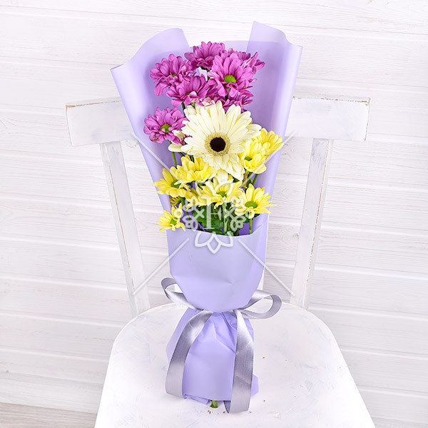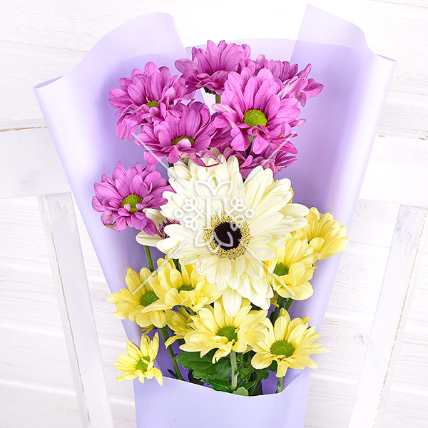 гербера кремовая - 1 шт, хризантема кустовая желтая- 1шт, хризантема кустовая сиреневая- 1шт,  упаковка, лента.