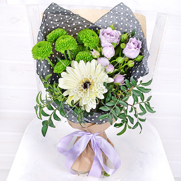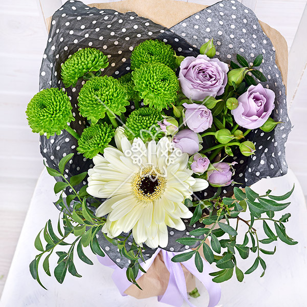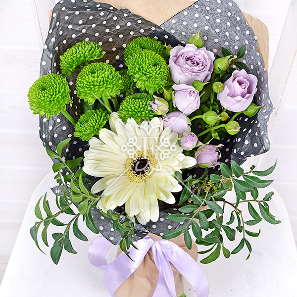Гербера кремовая – 1 шт., хризантема кустовая зеленая – 1 шт., кустовая роза фиолетовая – 1 шт., зелень декоративная (фисташка), упаковка, лента.